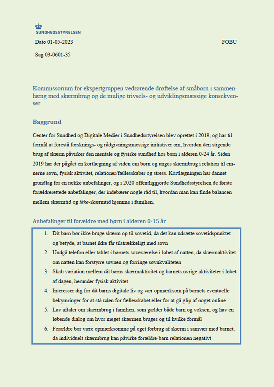 Sundhedsstyrelsen har nedsat en arbejdsgruppe som skal undersøge småbørns skærmbrug og mulige trivsels- og udviklingskonsekvenser og på den baggrund vurdere, om der er brug for skærpede anbefalinger om skærmbrug for 0-2 årige.