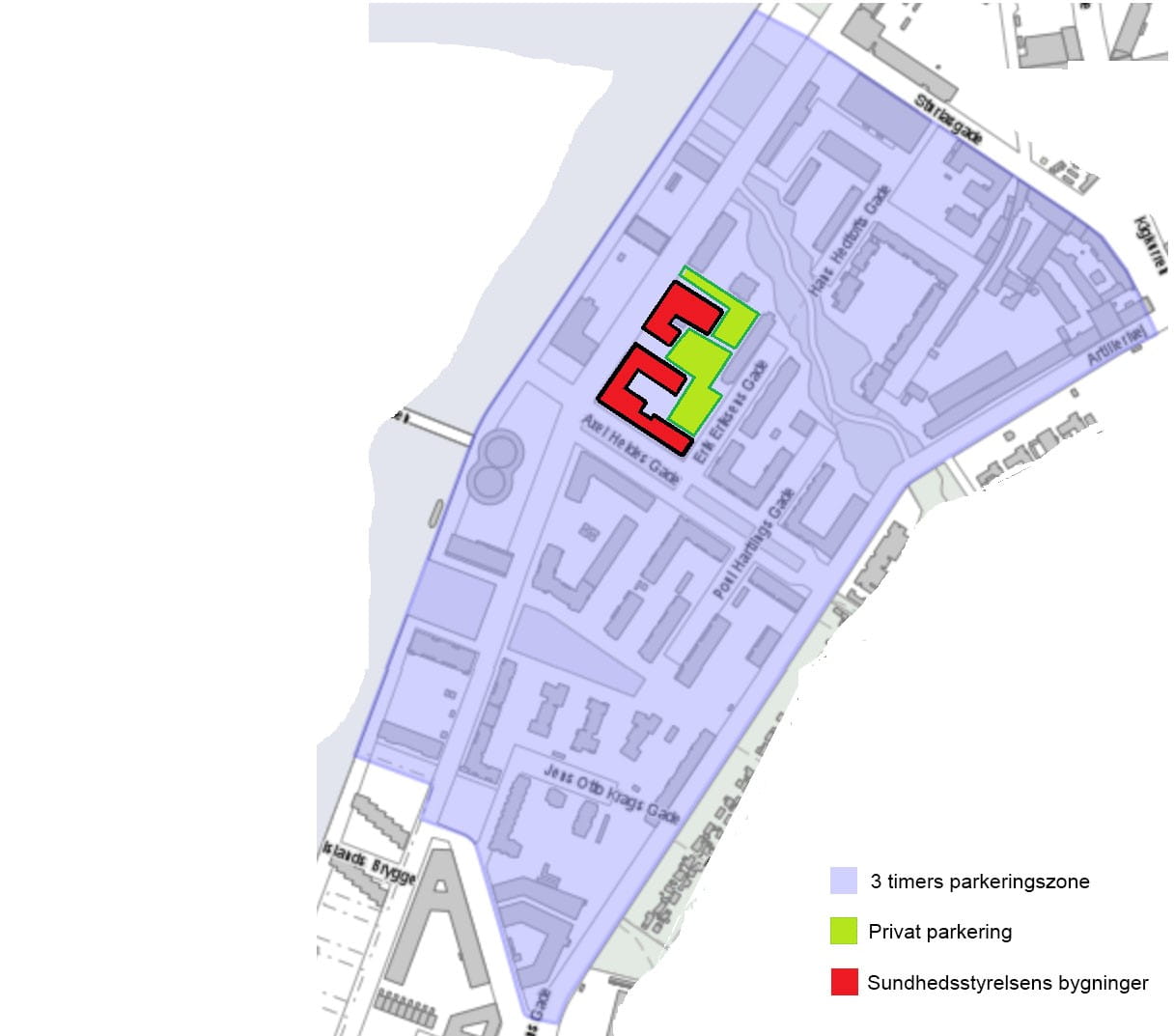 På Sundhedsstyrelsens parkeringsplads i gården (p-dæk og kælder) med indkørsel fra Erik Eriksens Gade det ikke muligt at parkere for gæster (markeret med grønt på kortet).