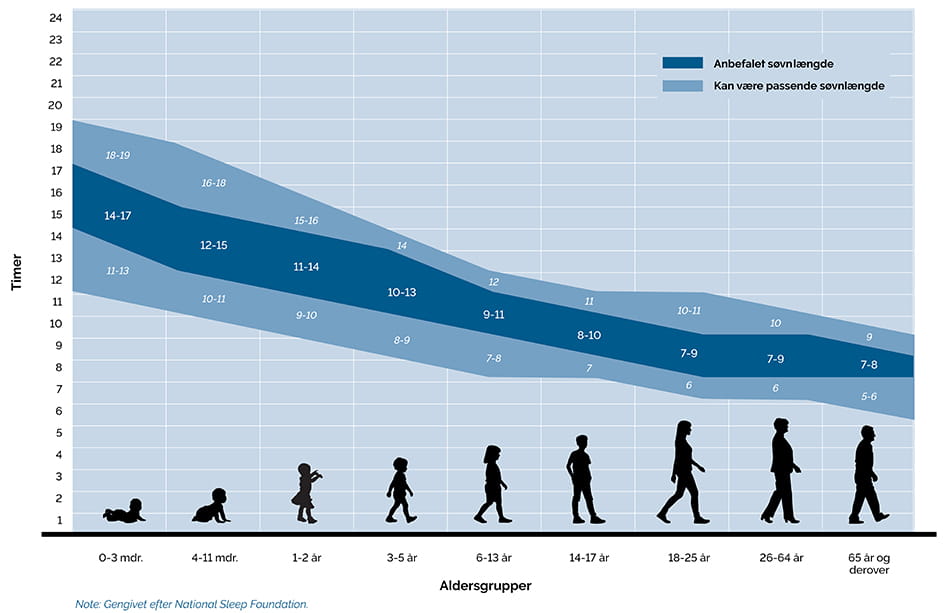 I nedenstående figur illustreres anbefalinger for søvnlængde til alle aldersgrupper. Endvidere illustreres søvnlængde, der kan være passende for den specifikke aldersgruppe.