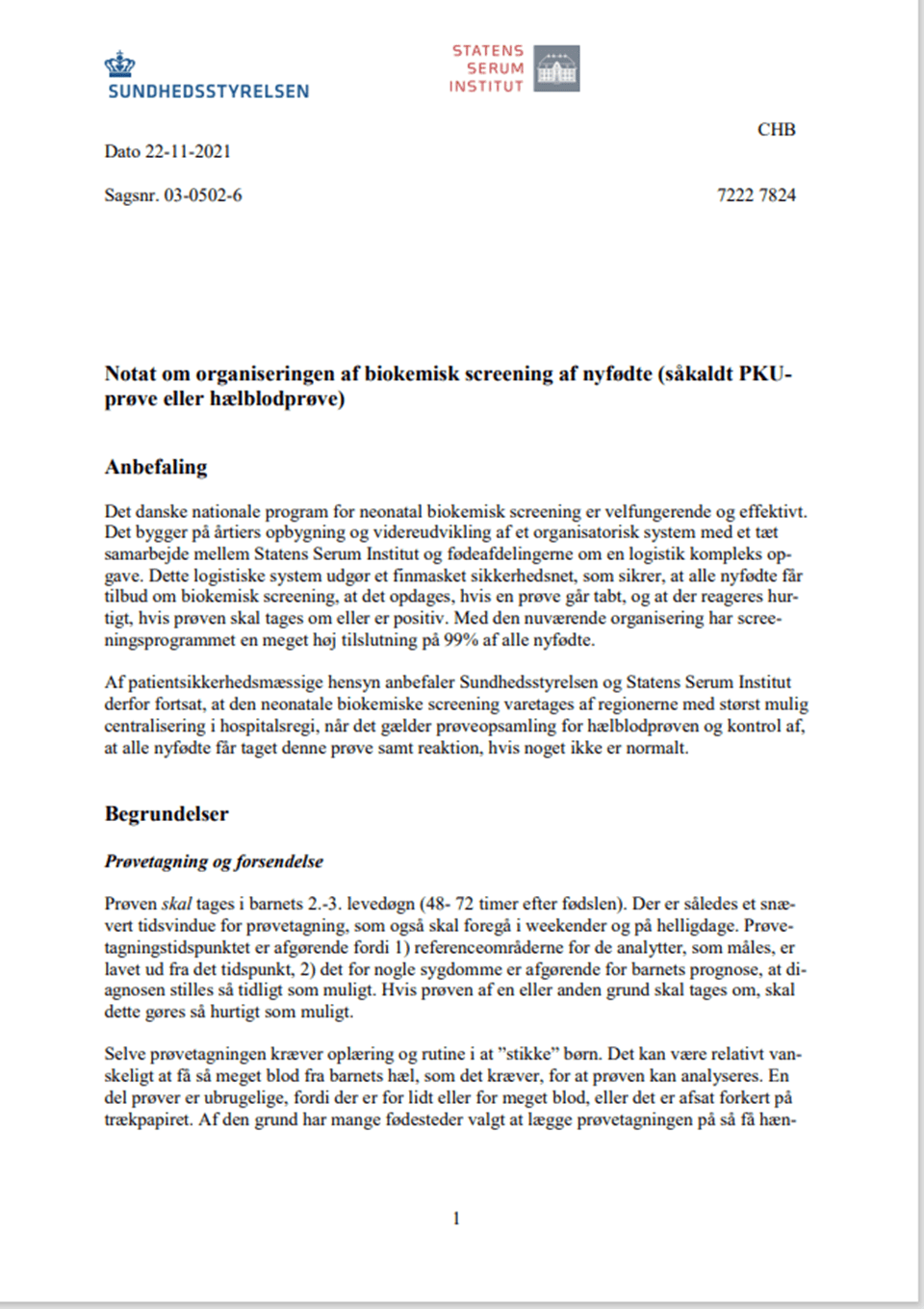 Af patientsikkerhedsmæssige hensyn anbefaler Sundhedsstyrelsen og Statens Serum Institut derfor fortsat, at den neonatale biokemiske screening varetages af regionerne med størst mulig centralisering i hospitalsregi, når det gælder prøveopsamling for hælblodprøven og kontrol af, at alle nyfødte får taget denne prøve samt reaktion, hvis noget ikke er normalt.