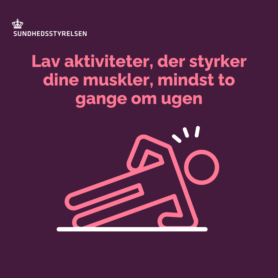 Du kan nemt lave øvelser, hvor du bruger din egen kropsvægt og alle de store muskler. Det vil sige ben, baller, ryg, mave og arme. Og selvfølgelig tæller det også med i de 30 minutters bevægelse, som du gerne skal nå op på hver dag.