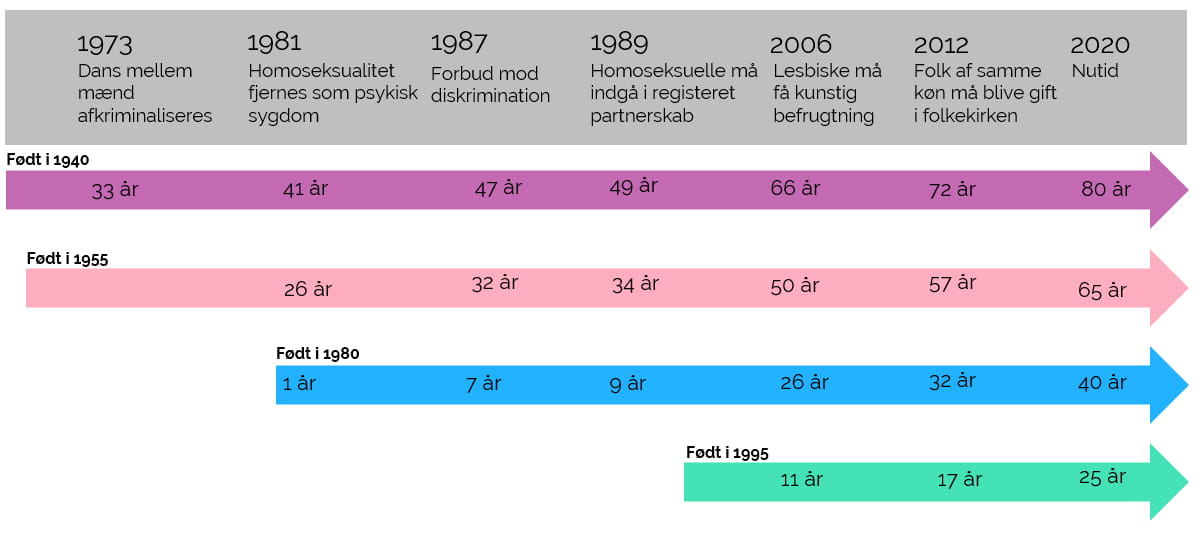 På figuren kan du se, hvilke historiske begivenheder LGBT+ personer har gennemlevet i Danmark, alt efter, hvor gamle de er i dag: