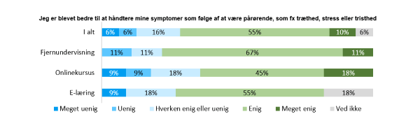 ”Jeg synes, jeg er blevet bedre til at sætte fokus på at have mere tid til mig selv, hvad jeg har lyst til og de tanker, jeg går med. Jeg er dårlig til at lægge aftaler i kalenderen på grund af situationen. Der har det været godt, at jeg får booket mig-tid i kalenderen til fx at ligge ned og se TV, træne eller andet.” - Kursist, Fjernundervisning