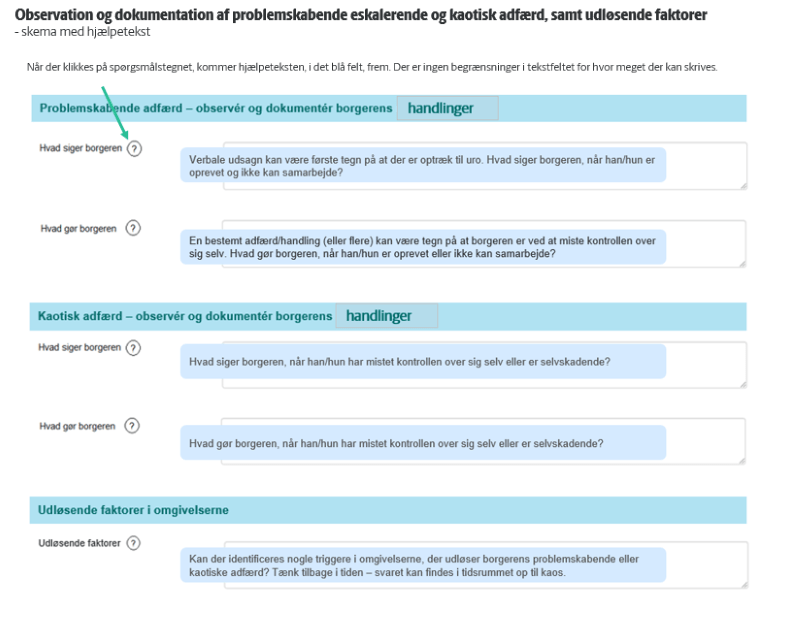 Observationerne kan være af sensorisk-, sproglig-, motorisk- og social karakter. Registreringerne skal bruges til at få øje på sammenhænge og mønstre, så personalet kan identificere hvilke triggere, der får affektintensiteten til at stige hos den enkelte borger. Formålet med den tryghedsskabende handlingsanvisning er at forbedre praksis omkring forståelse, forebyggelse og håndtering af problemskabende adfærd i ældreplejen, og medarbejderne får mulighed for at tilrette praksis og døgnrytmeplaner. Dokumentationsværktøjet skal kunne rumme alle borgere med kognitive udfordringer, som er bosiddende i eget hjem eller på et plejecenter.