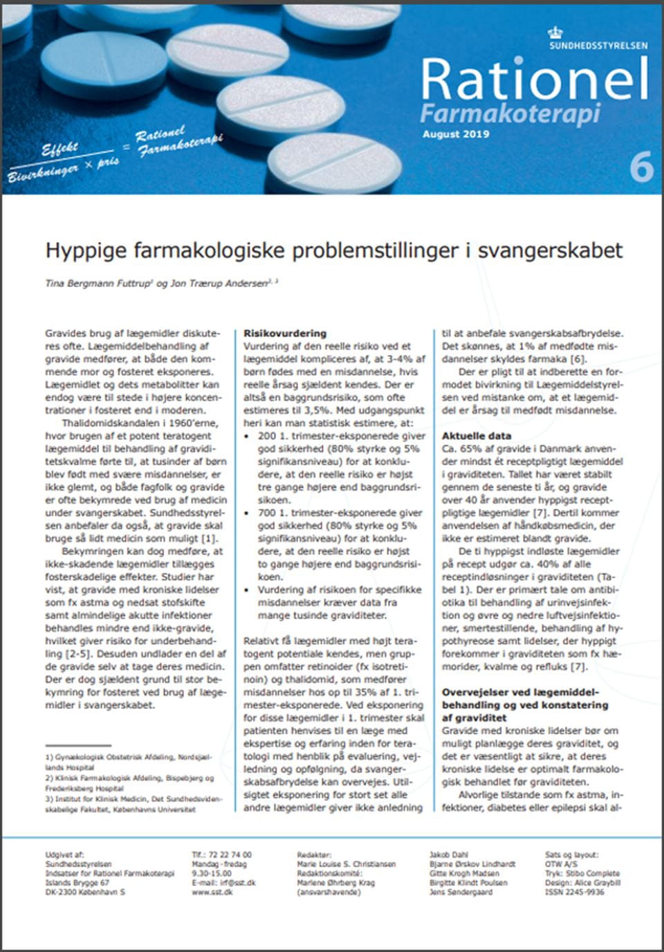 Månedsbladet Rationel Farmakoterapi sætter denne gang fokus på gravide og lægemidler. Bladet beskriver flere af de hyppigste sygdomme blandt gravide, fx infektioner, astma, allergi og smertetilstande. Derudover er der omtale af behandlingen af lavt stofskifte og depression og af hyppige lidelser som kvalme og hæmorider.