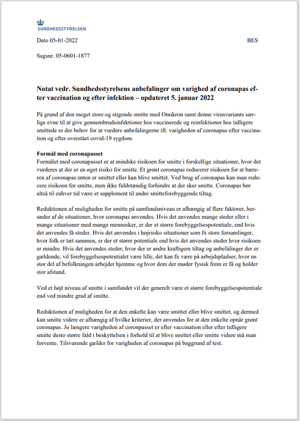 Titel: Notat vedr. Sundhedsstyrelsens anbefalinger om varighed af coronapas efter vaccination og efter infektion – opdateret 5. januar 2022