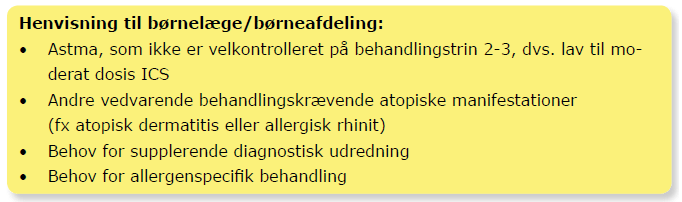 Ved svær/kompliceret astma eller tvivl om diagnosen bør der henvises til en børnelæge med specialviden om astma hos børn (se boks).