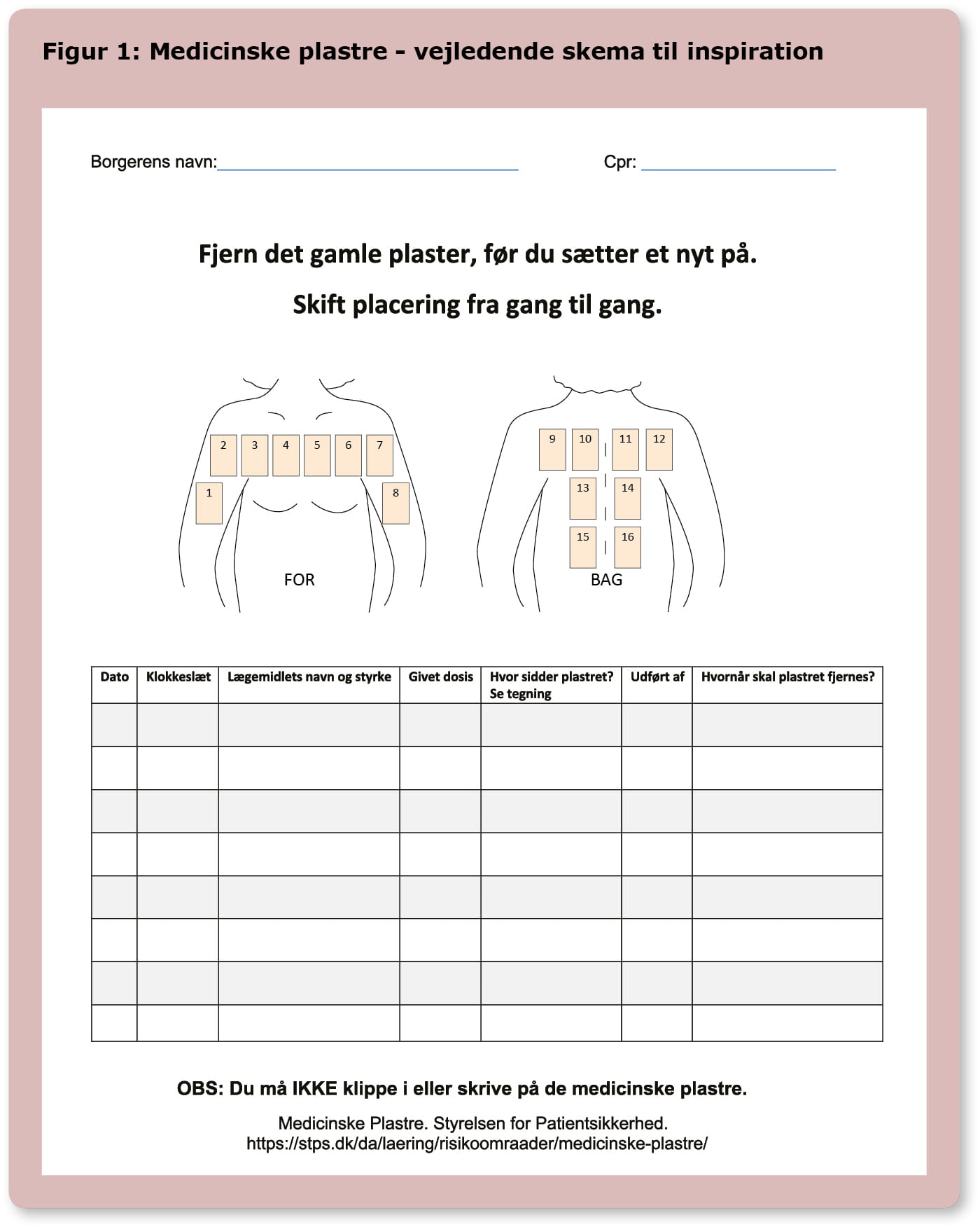 Det anbefales, at den der administrerer medicinske plastre, benytter et kropsskema (se Figur 1, kun elektronisk tilgængelig) som et selvstændigt hjælpeværktøj. Kropsskemaet er udarbejdet af Styrelsen for Patientsikkerhed til inspiration [16]. Med dette dokumenteres
