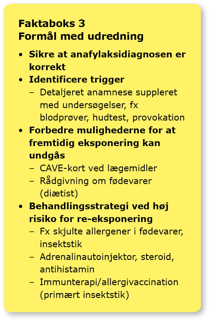 Faktaboks 3 Formål med udredning - Sikre at anafylaksidiagnosen er korrekt - Identificere trigger - Detaljeret anamnese suppleret med undersøgelser, fx blodprøver, hudtest, provokation - Forbedre mulighederne for at fremtidig eksponering kan undgås - CAVE-kort ved lægemidler - Rådgivning om fødevarer (diætist) - Behandlingsstrategi ved høj risiko for re-eksponering - Fx skjulte allergener i fødevarer, insektstik - Adrenalinautoinjektor, steroid, antihistamin - Immunterapi/allergivaccination (primært insektstik) |
