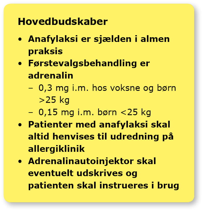 Hovedbudskaber - Anafylaksi er sjælden i almen praksis - Førstevalgsbehandling er adrenalin - 0,3 mg i.m. hos voksne og børn >25 kg - 0,15 mg i.m. børn <25 kg - Patienter med anafylaksi skal altid henvises til udredning på allergiklinik - Adrenalinautoinjektor skal eventuelt udskrives og patienten skal instrueres i brug |