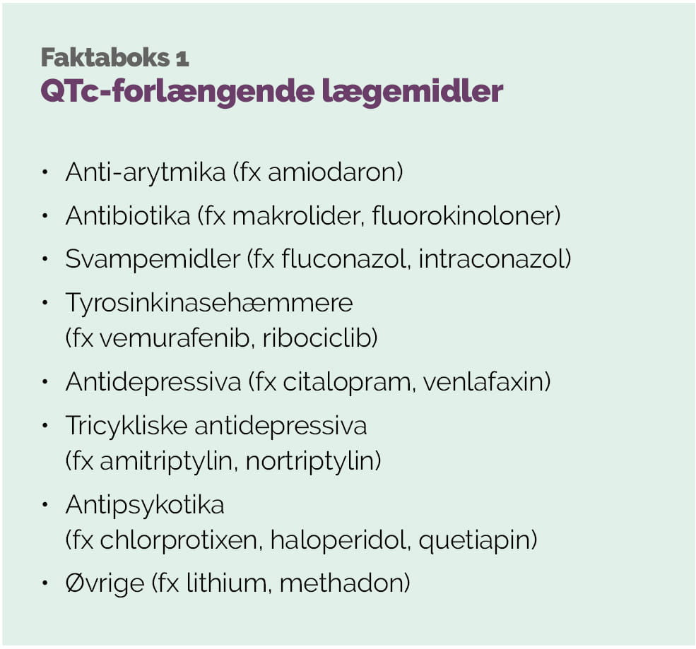 Psykofarmaka er den type lægemidler, som hyppigst giver forlænget QTc og pro-arytmi, men også andre grupper af lægemidler kan øge QTc (Faktaboks 1) [4,8-10].