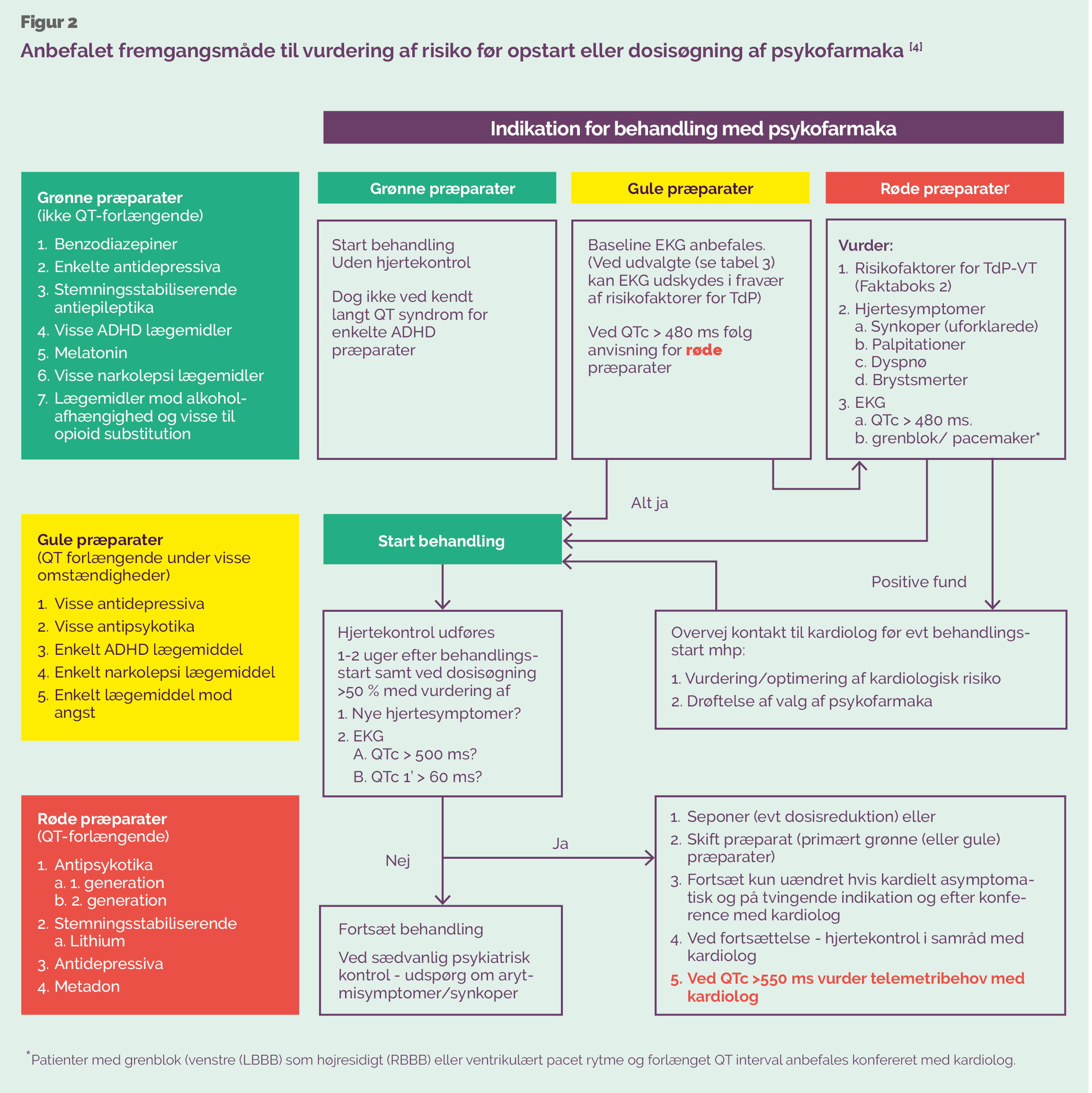 Kardiologiske, psykiatriske og klinisk farmakologiske specialister udgav i 2023 version 2 af rapporten ”Arytmi-risiko ved anvendelse af psykofarmaka” med gennemgang af evidensen og kliniske anbefalinger til vurdering og håndtering af risikoen for QT-forlængelse [4]. I rapporten understreges det, at en for restriktiv holdning til behandling med lægemidler med potentiale for QT-forlængelse ikke må hindre indikeret behandling af en alvorlig psykisk sygdom [4]. I rapporten findes en rød-gul-grøn-liste som afspejler risikoen for QT-forlængelse for hvert af de hyppigst anvendte psykofarmaka samt en algoritme til klinisk vurdering og behov for EKG-kontrol mv. (Figur 2) [4]. Selvom der i rapporten er fokus på psykofarmaka, kan de kliniske anbefalinger og fremgangsmåden i algoritmen anvendes generelt ved behandling med lægemidler med risiko for QT-forlængende potentiale (Faktaboks 1 og Figur 2) [4]. Endelig udpeges der i rapporten en række lægemidler, der trods advarsel om forlænget QTc kan opstartes uden forudgående EKG hos patienter uden risikofaktorer for forlænget QTc og proarytmi (Faktaboks 3).